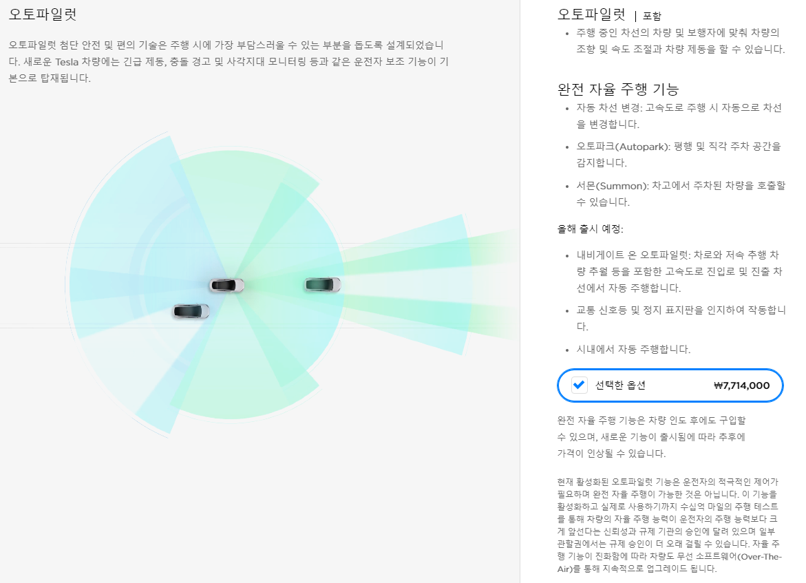 그런데 단순히 자동 차선변경, 자동주차, 호출(서몬), 그리고 아직 출시되지 않은 NOA(네비게이트 온 오토파일럿), 교통 신호등 및 정지 표지판 인식, 시내에서의 자동주행을 위해 무려 7,714,000원을 지불한다?