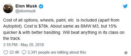이 기능을 이야기하며 엘론은 BMW의 M3를 지목하여 트위터를 날립니다.