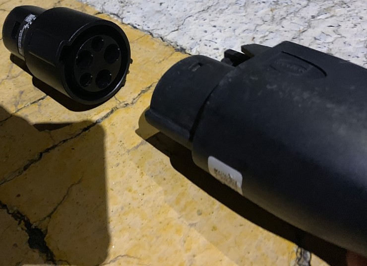 사진의 오른쪽은 공용 완속 충전기에 달려있는 AC 5핀 포트 케이블입니다.
