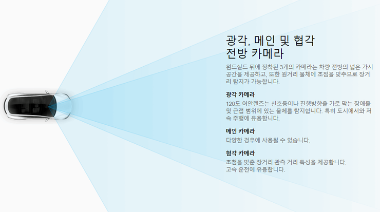 | -. 테슬라의 진화된 감지 범위 (8개의 카메라, 12개의 초음파 센서, 1개의 레이더) |
