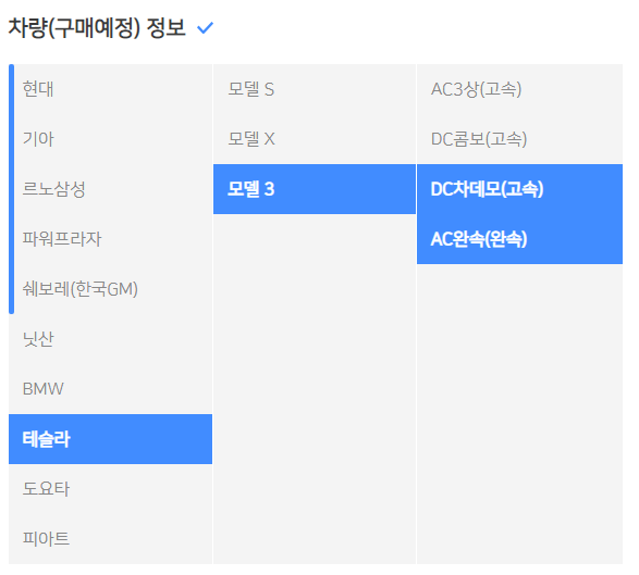 현재(2019년 9월 2일)기준으로 테슬라는 DC차데모(고속)과 AC완속(완속)만 지원합니다.