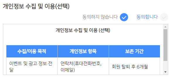 중간에 개인정보 수집 및 이용 항목은 '동의하지 않습니다' 선택 잊지 마시구요