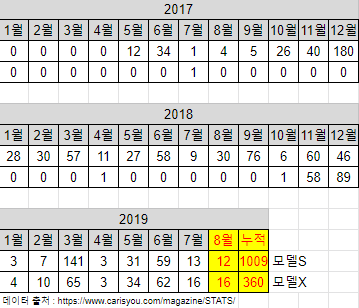 2019년 8월, 모델S가 12대, 모델X가 16대 팔리면서 드디어 단일모델 판매량 1,000대를 돌파하였습니다.