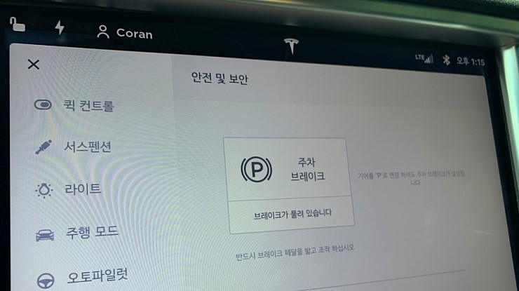 테슬라 화면에서 '안전 및 보안' 쪽으로 가시고, 주차 브레이크 버튼을 눌러줍니다.