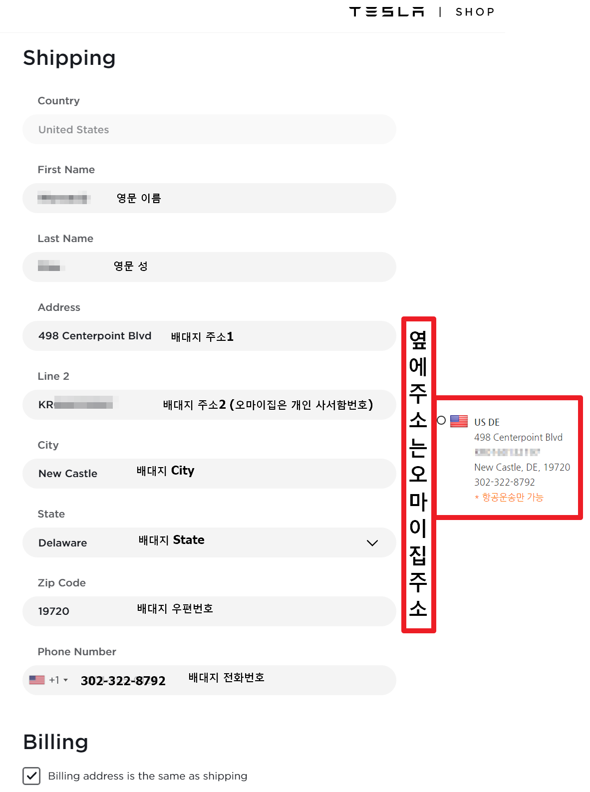 -. 테슬라에서 추천하는 변형된 주소(Suggested Address)를 쓰면 개인 사서함 번호가 지워져서 배대지 입고시 문제가 생길 수 있습니다.