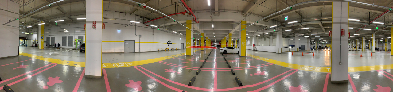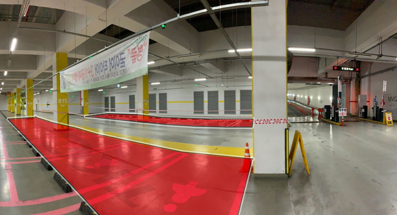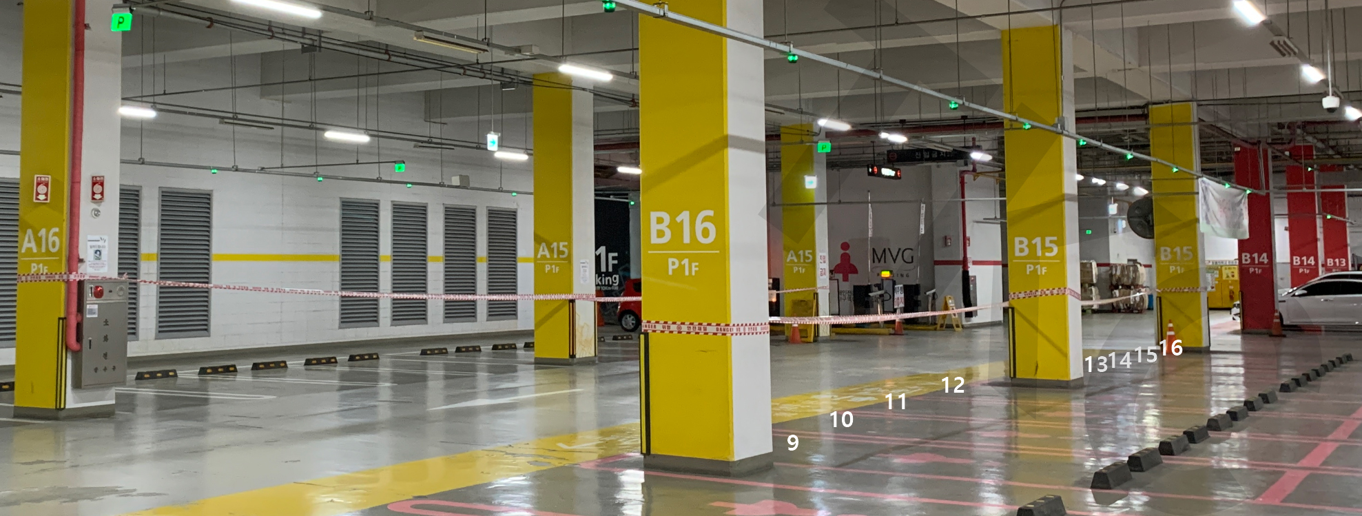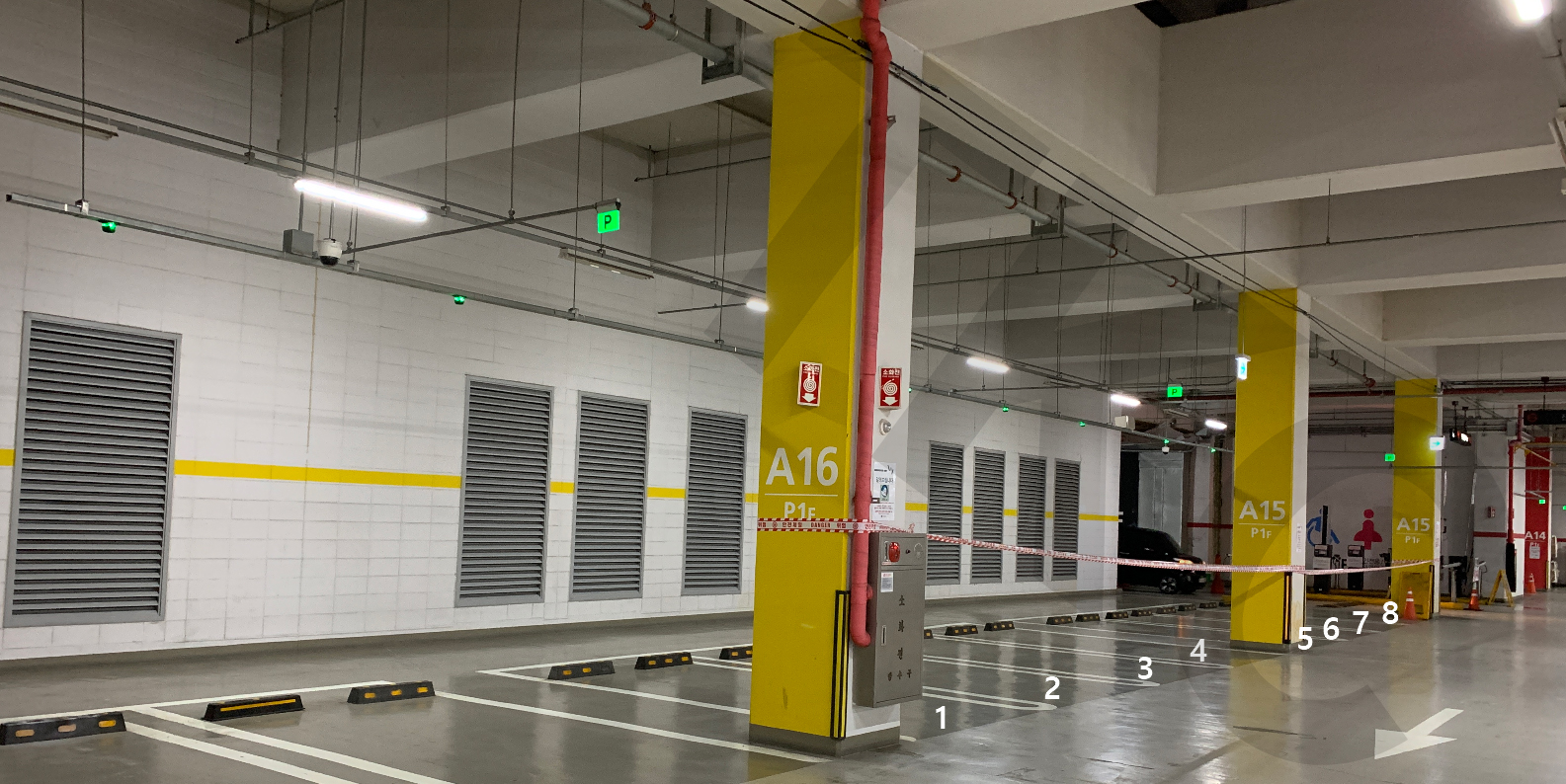 재밌는 것은 벽 반대편 주차자리도 주차를 못하게 끈을 둘러두었더군요.