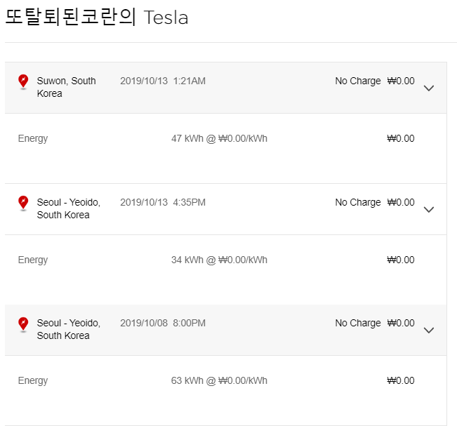 실제로 과금만 되지 않고 있을 뿐, 수퍼차저 이용에 대한 기록은 모두 테슬라에 기록되고 있습니다.