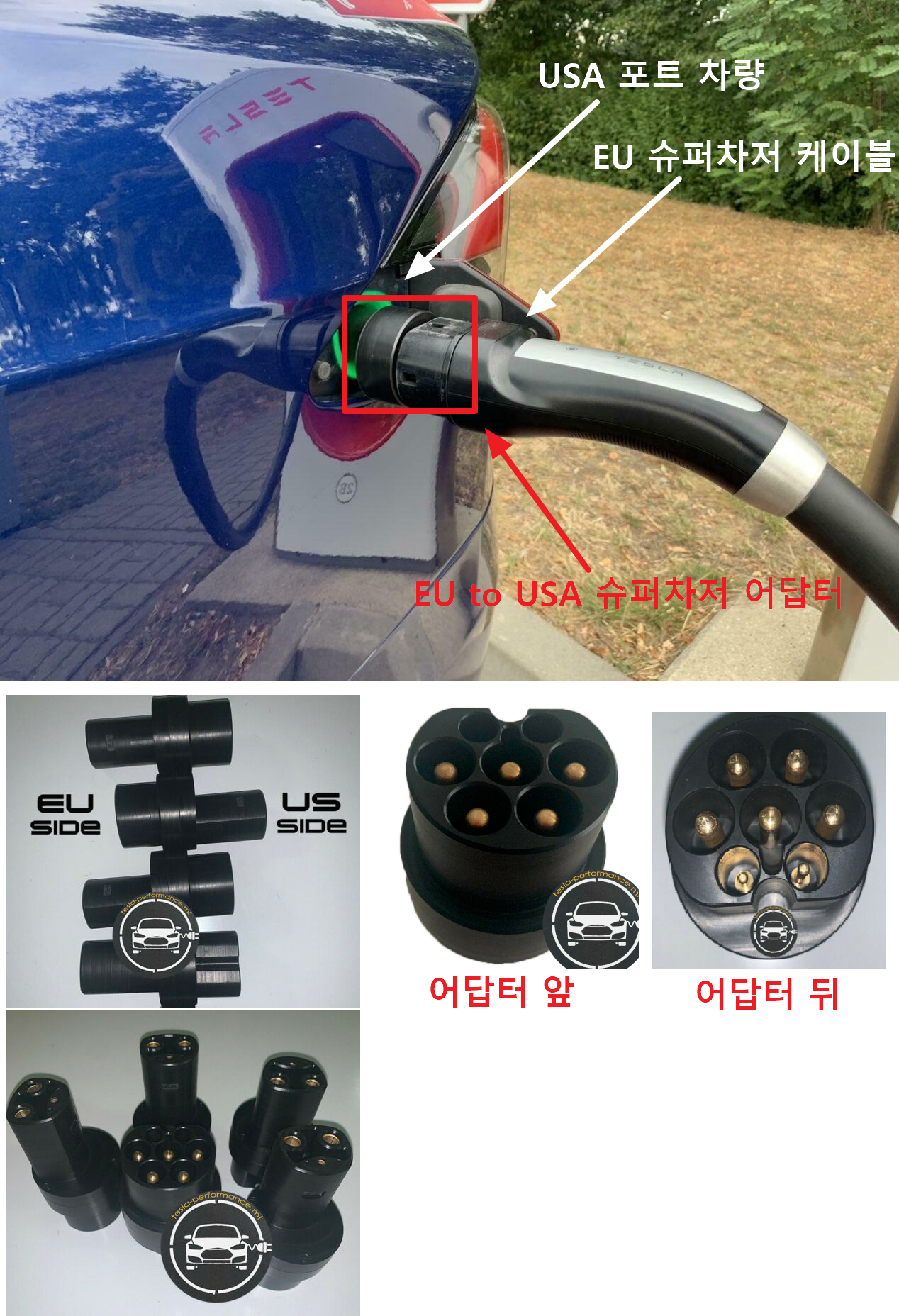 유럽형 슈퍼차저를 북미포트 테슬라(대한민국 출고 차량)에 사용할 수 있는 어답터가 존재합니다.