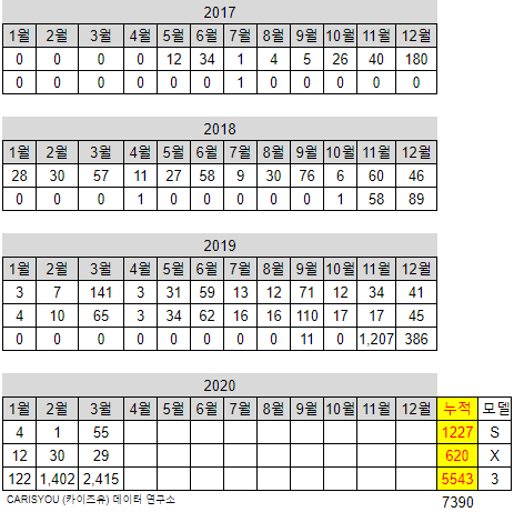 3월을 피크로 4월에 소폭 감소한 뒤에 5월부터는 출고 수가 많이 줄지 않을까 예상해봅니다.