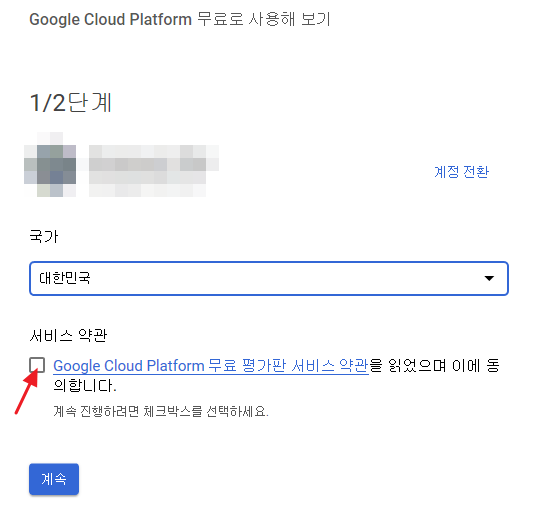 서비스 약관 체크 후 동의하고 '계속' 을 클릭합니다.