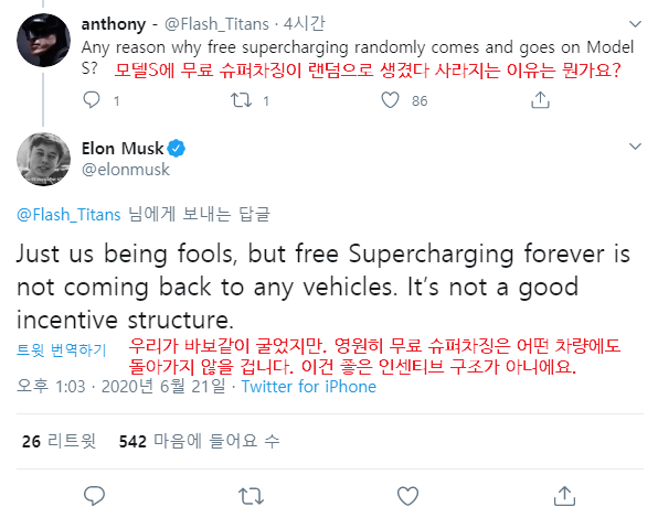 6월 21일, 한 유저가 '왜 랜덤으로 모델S에 무료 수퍼차징 옵션이 생겼다 없어졌다 하냐'고 물었더니