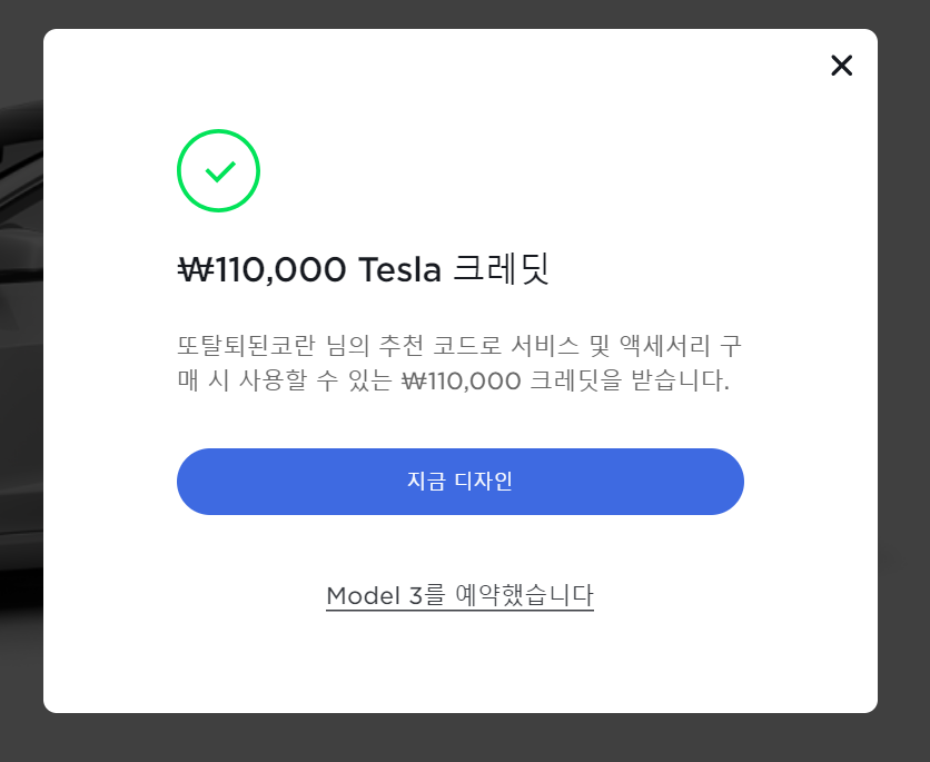 모델S 오너인 제 추천 코드를 사용하여 Tesla 신차 구매 시 서비스 및 액세서리 구매에 사용할 수 있는 ₩110,000 크레딧을 받을 수 있습니다. 레퍼럴 코드 사용 후에 비밀 덧글로 영문 성함을 보내주시면 제대로 등록되어있는지 확인해드리겠습니다.