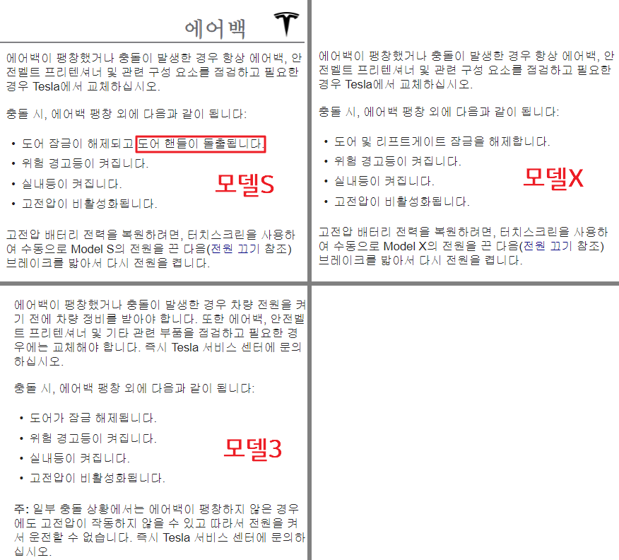 우선 국내에 시판되는 모들 테슬라 모델의 사용자 설명서에서는 사고시 도어의 잠금 해제가 전부 명시되어있습니다.