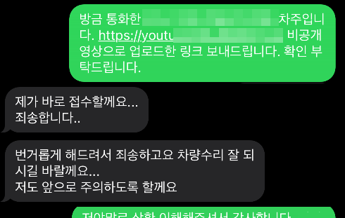 -. 가해 차주에게 전화로 연락하여 문콕 사실을 이야기하고, 사고 당시 영상과 손상부위 사진을 전송합니다.