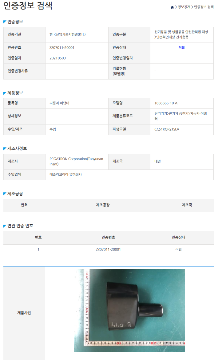 테슬라코리아에서 올해 상반기 출시한다고 발표했던 DC콤보 어댑터가 정식 인증 완료되었습니다.