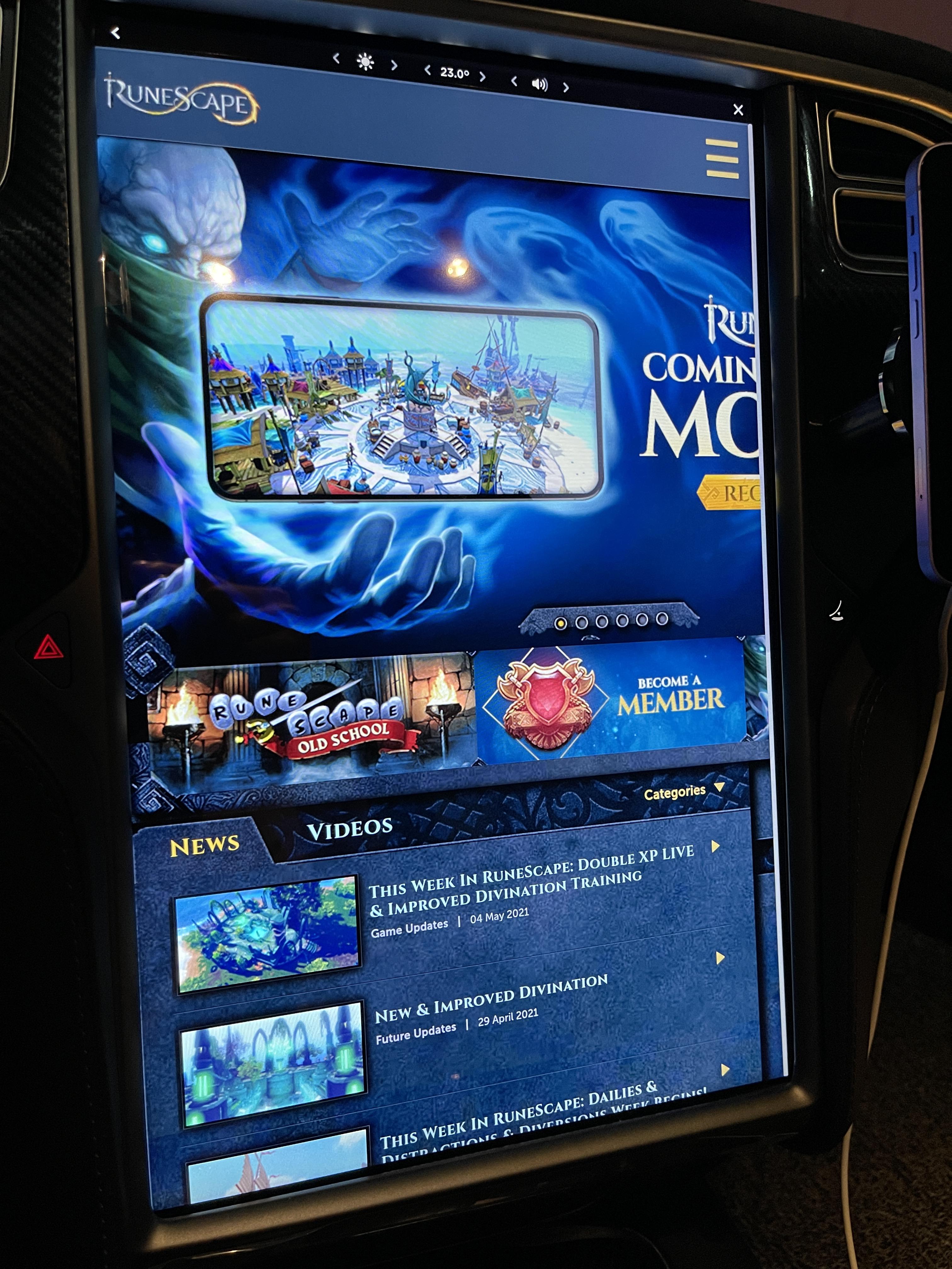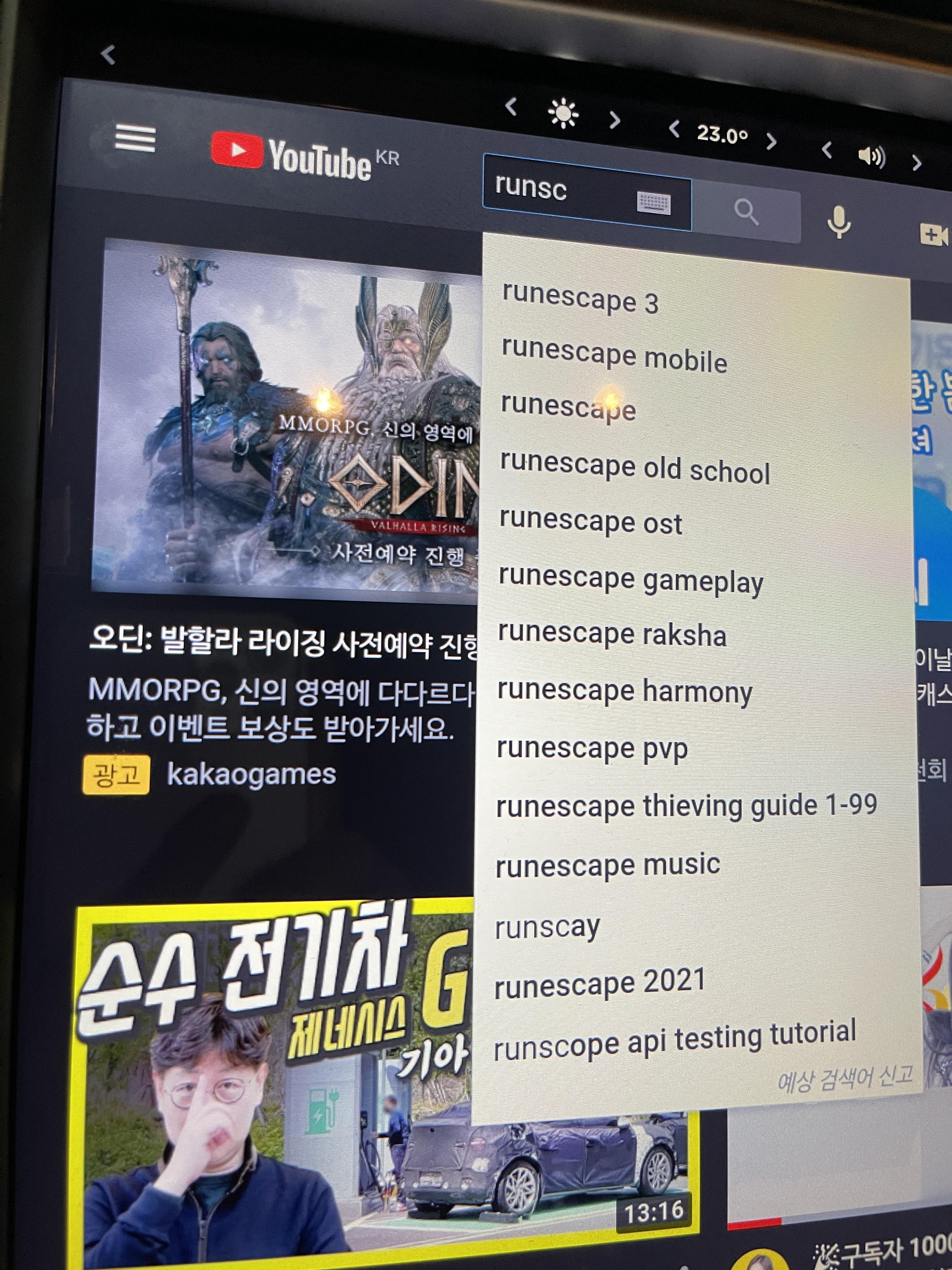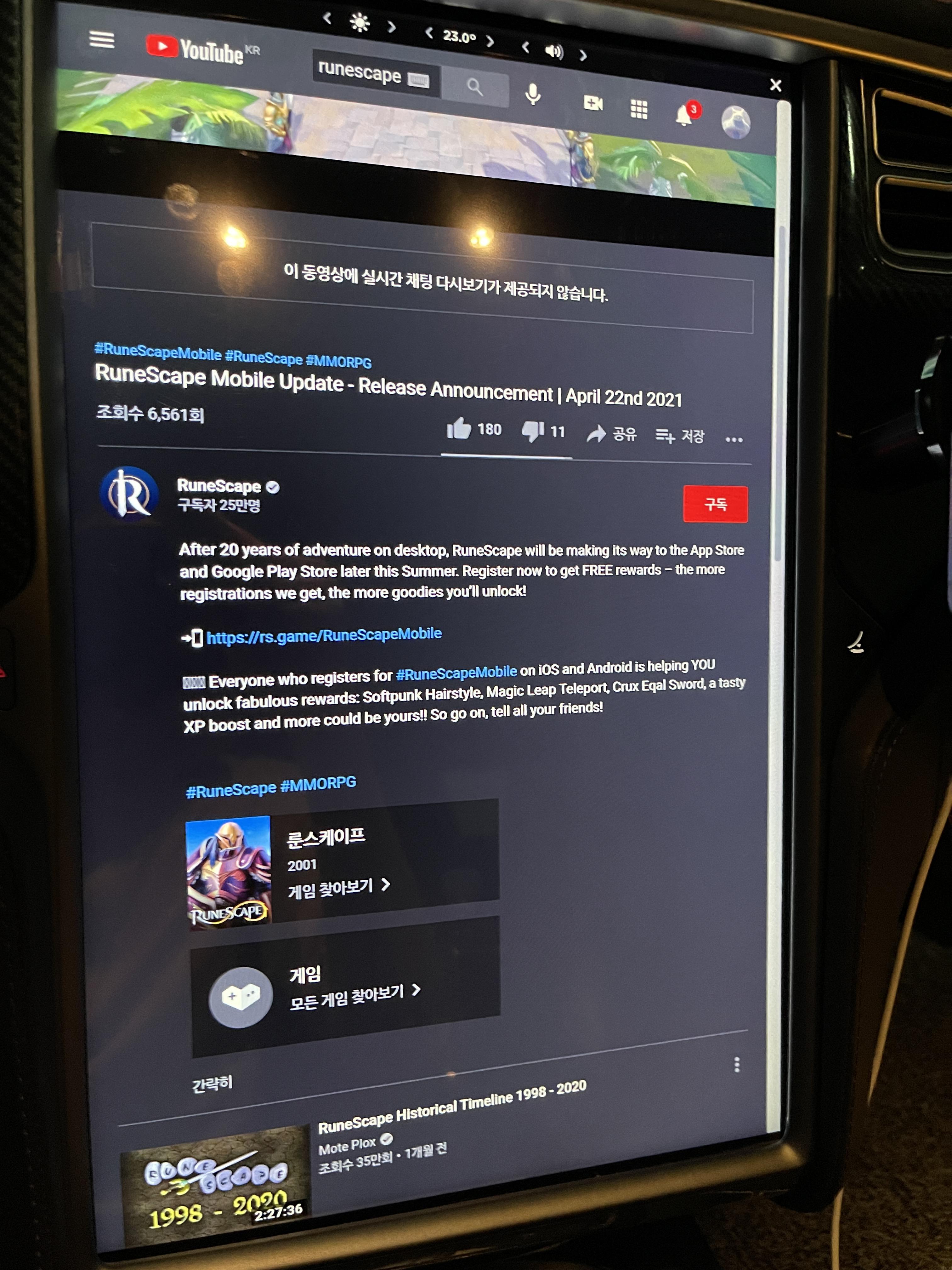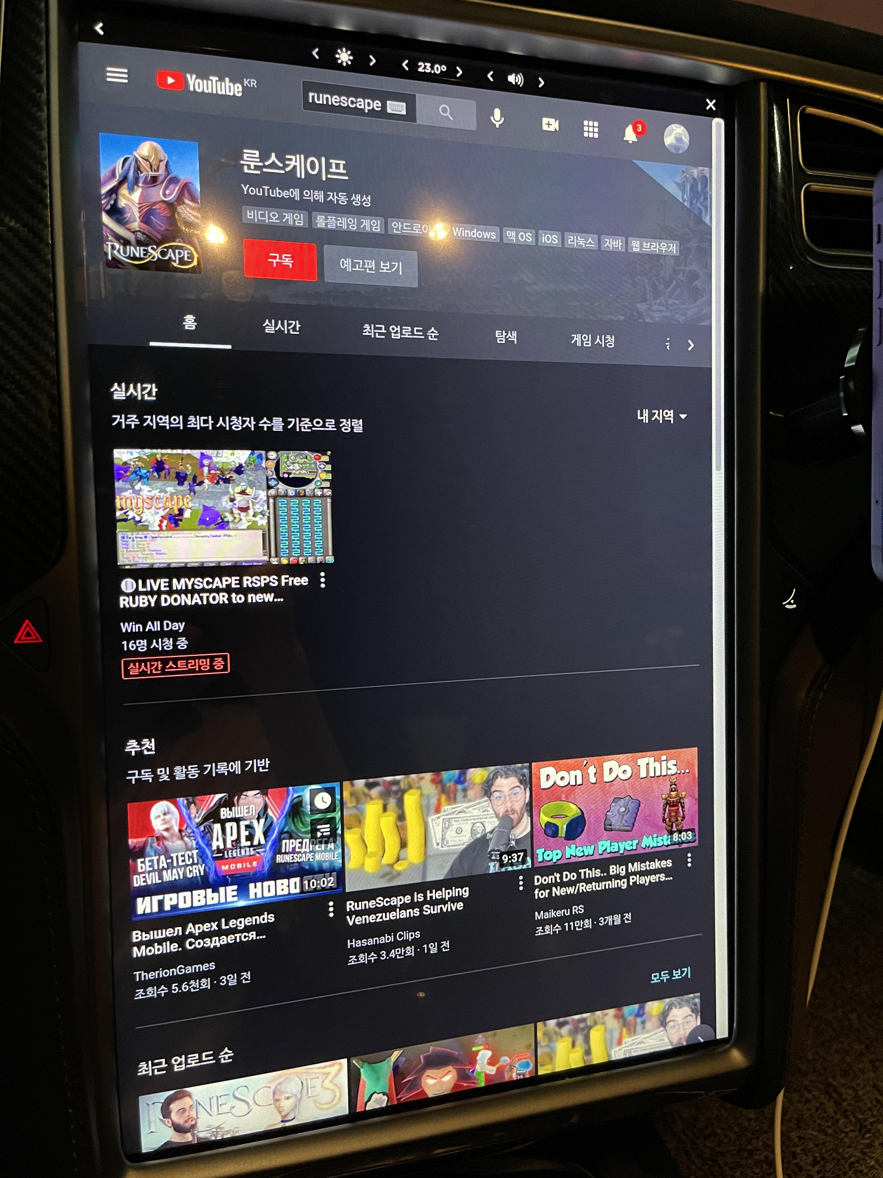 테슬라 내부 유튜브 앱에 들어가서 runescape을 검색합니다.