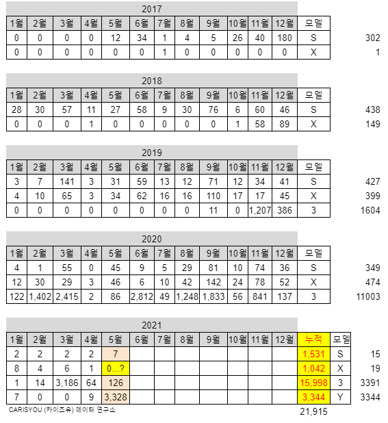 이걸로 이제 국내 테슬라는 2만대를 돌파! 총 21,915대가 되었습니다.