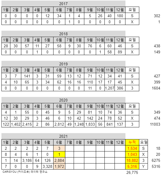 | 2021년 5월 테슬라 판매량, 수입차 1위 등극! 2만대 돌파! (1) | 2021.06.03 |
