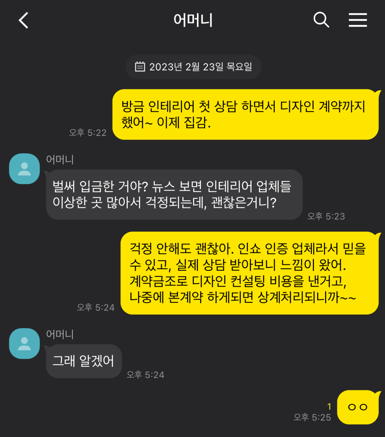 첫 미팅에서 큰 금액은 아니지만 디자인 진행 비용을 입금했다고 하니 집안에서 걱정을 많이 하셨던 기억이 납니다.