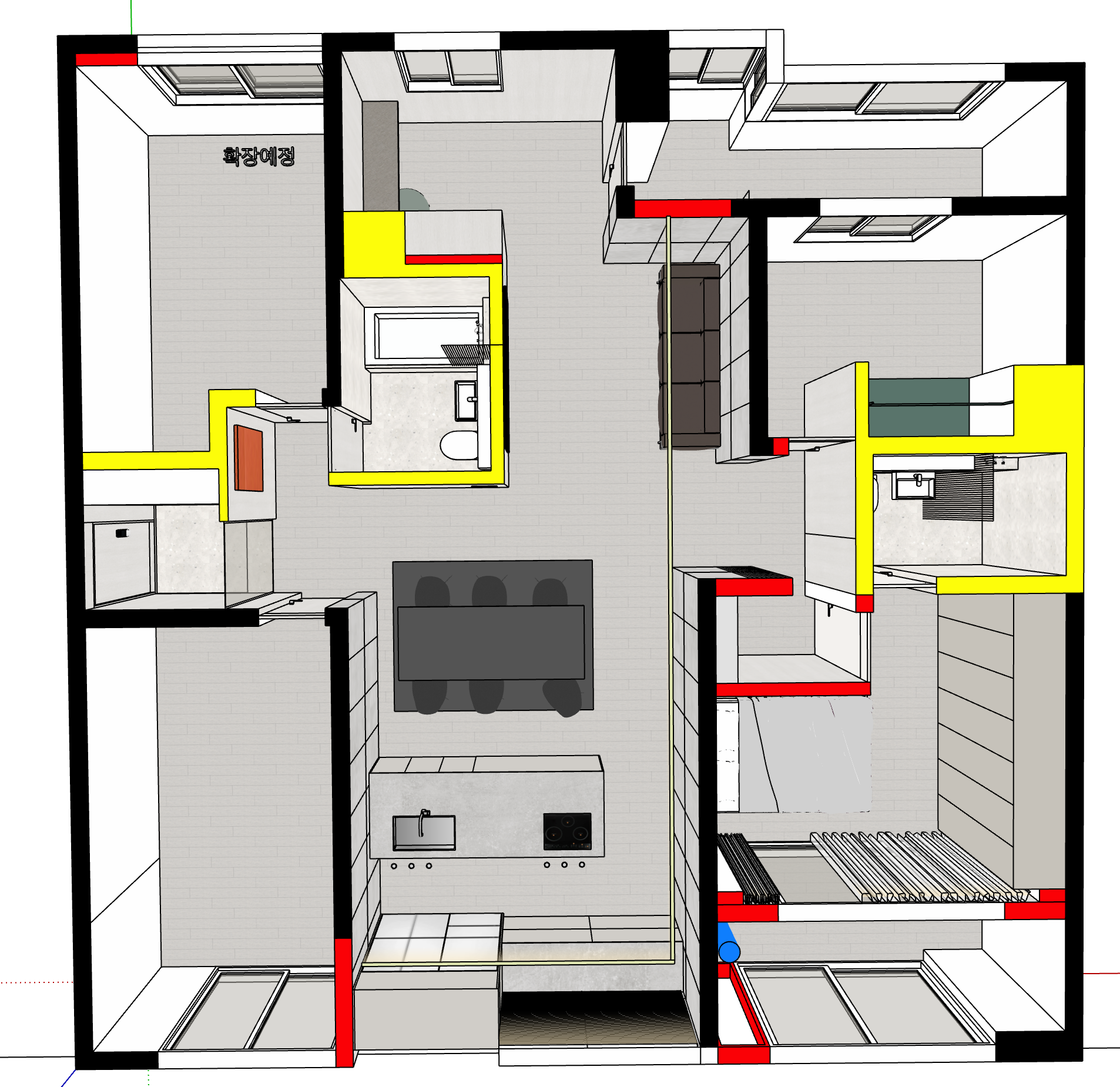 거실에 튀어나온 화장실을 없애고 그 자리를 주방으로 확장하는 아이디어였습니다.