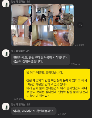 인테리어 업체와 단톡방을 파고 거기서 상황을 사진으로 계속 공유받았습니다.