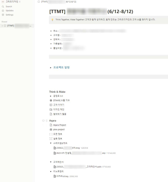 인테리어 공사가 진행되면서 업데이트되는 사진, 도면, 사용될 자재, IoT 기기들에 대한 정보 등은