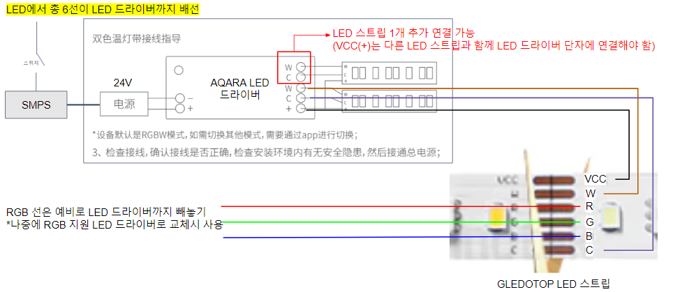 VCC, W, C 3가닥 외에 R,G,B 3가닥까지 총 6가닥 씩 모두 배선해주셨습니다.