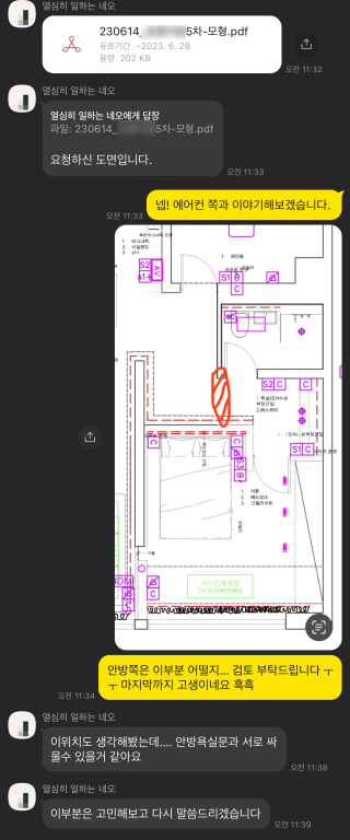 도면이 수정되면 정리해서 대표님께서 PDF 혹은 스케치업, 필요시 캐드 원본 파일을 보내주셨습니다.