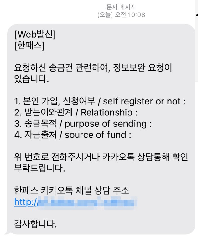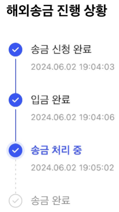 저 같은 경우 첫 송금때는 '입금완료' 단계 후 진행이 안되다가, 입금 다음날 문자로 이런 메세지가 왔습니다