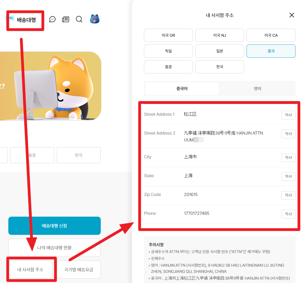 가입 후 배송대행 -> 내 사서함주소 -> 중국을 누르면 주소가 뜹니다.