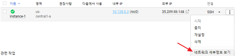 구글 클라우드로 돌아가서 '네트워크 세부정보 보기' 로 갑니다.