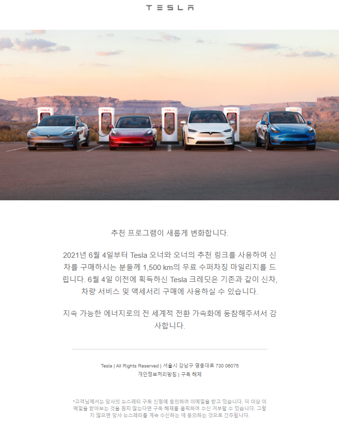 2021년 6월 4일부터 Tesla 오너와 오너의 추천 링크를 사용하여 신차를 구매하시는 분들께 1,500 km의 무료 수퍼차징 마일리지를 드립니다. 6월 4일 이전에 획득하신 Tesla 크레딧은 기존과 같이 신차, 차량 서비스 및 액세서리 구매에 사용하실 수 있습니다.