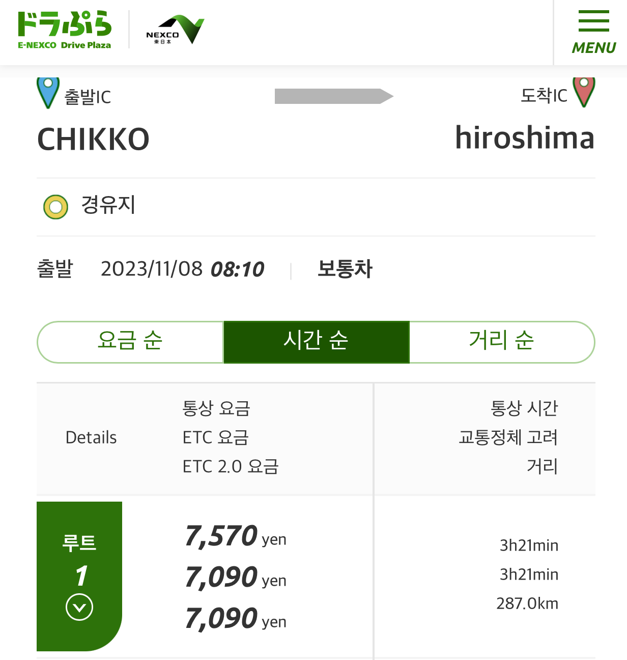 후쿠오카에서 히로시마까지 톨비는 대략 6~7만원 정도 소요됩니다.