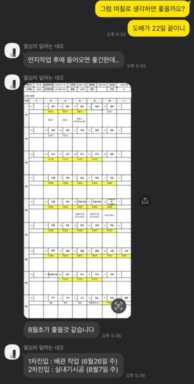 인테리어 업체와 단톡방을 파고 거기서 상황을 사진으로 계속 공유받았습니다.