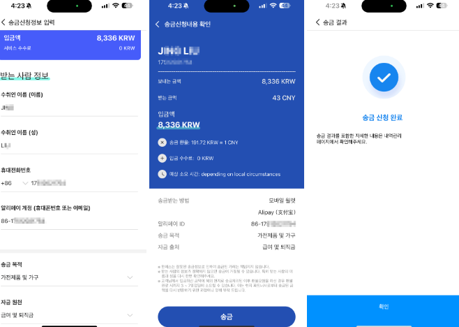 참고로 Hanpass의 중국 위안화 알리페이 송금 수수료는 없습니다.
